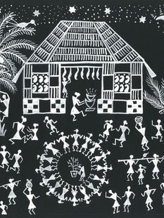 Warli painting is monochromatic, mostly in white pigment, through basic geometric expressions- a circle, a triangle, and square. The central motif of these rituals are paintings, hunting, fishing, farming, festivals, dances, trees & animals. A common pattern in Warli art is circles without ends or beginnings. These circles represent their belief that death is a new beginning rather than an end.